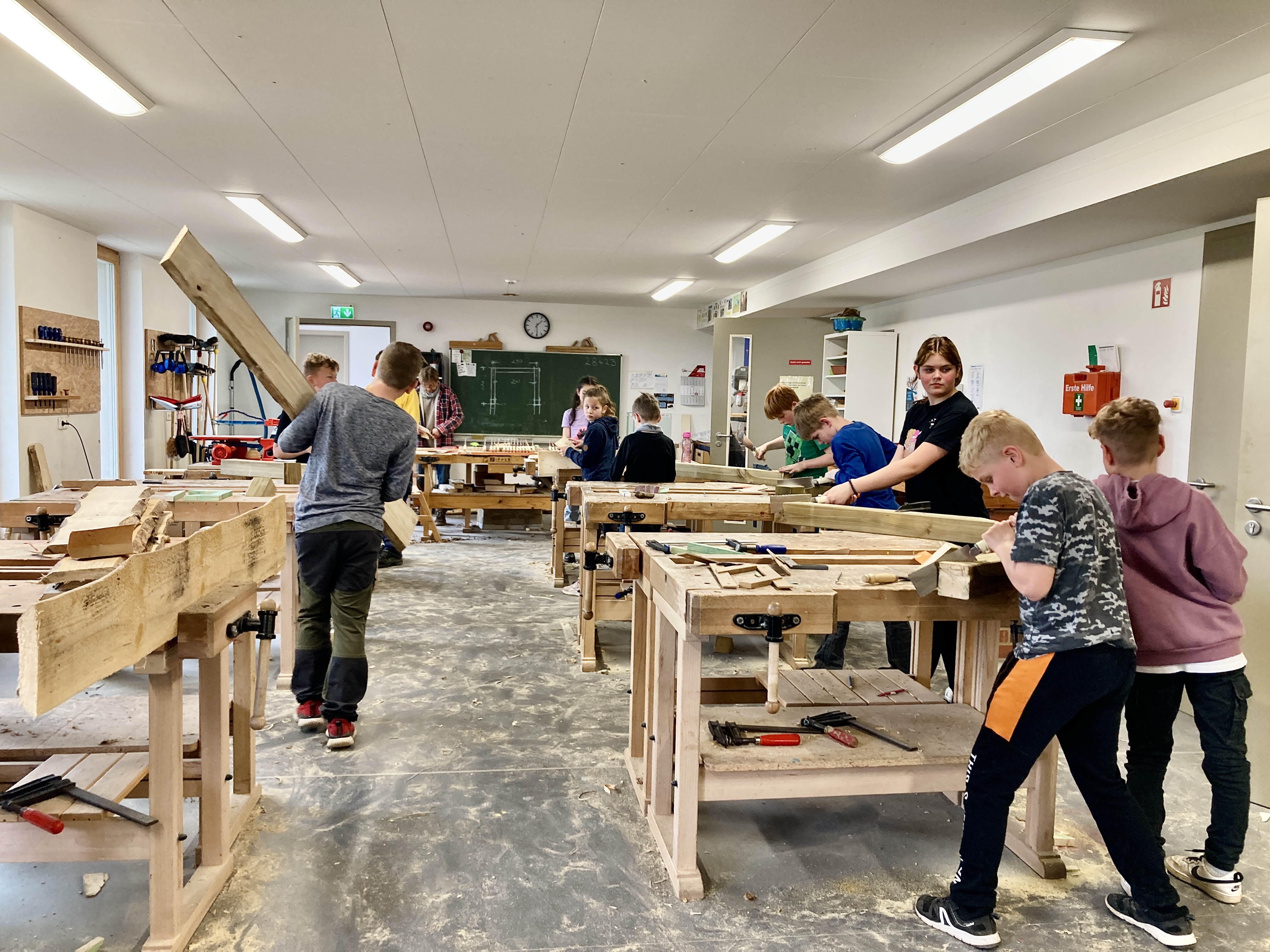 Das Handwerk nimmt an unserer Schule einen wichtigen Stellenwert ein. Neben dem Unterrichtsfach „Technisches Werken“ sind die Werkenwochen in den Klassen 4, 5 und 6 fester Bestandteil. Die Schülerinnen und Schüler wählen sich in verschiedene Gruppen ein und werden handwerklich mit Holz, Lehm, Ton und vielem mehr aktiv - unter fachlicher Anleitung der Lehrkräfte und unserem Werkstattmeister. Auf unserem Schulgelände befinden sich bereits viele tolle Ergebnisse der Werkenwochen: ein selbst geplantes und umgesetztes Fachwerkhaus, ein Außenbackofen, viele Sitzgelegenheiten, Treppen, Geländer, Zäune, Rutschen oder Spielplätze.