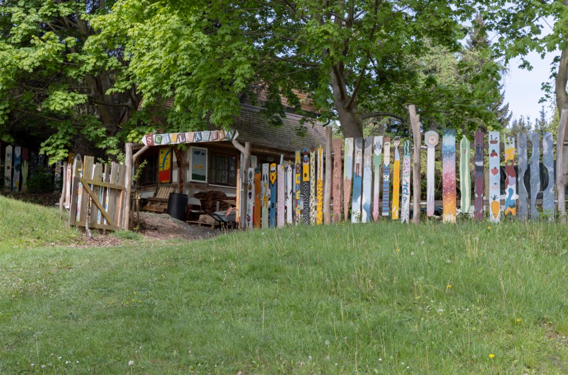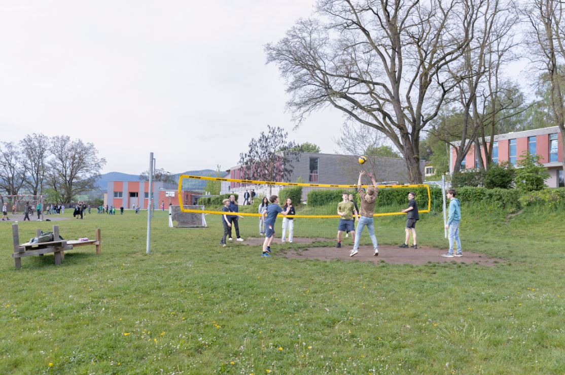 Unser Außengelände bietet vielseitige Möglichkeiten für die Pausengestaltung und praktischen Unterricht. Den Schülerinnen und Schülern stehen mehrere „Pausenhöfe“ und der Sportplatz zur freien Verfügung. In unserem Schulgarten befinden sich ein selbst erbautes Fachwerkhaus, ein selbst gemauerter Ofen, Streuobstwiesen mit Insektenhotels und Gemüsebeete. Auf unserem Gelände haben mehrere Bienenvölker ihre Heimat, um welche sich in der Kreativzeit Imkern gekümmert wird.